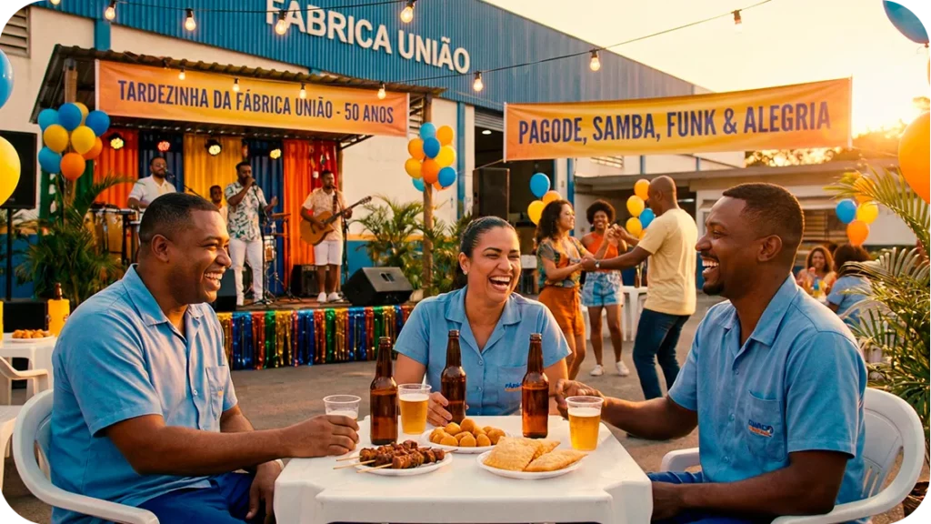 Uma comemoração em formato de “tardezinha” cria um ambiente descontraído, leve e acolhedor, ideal para celebrar o aniversário da empresa sem formalidades excessivas.