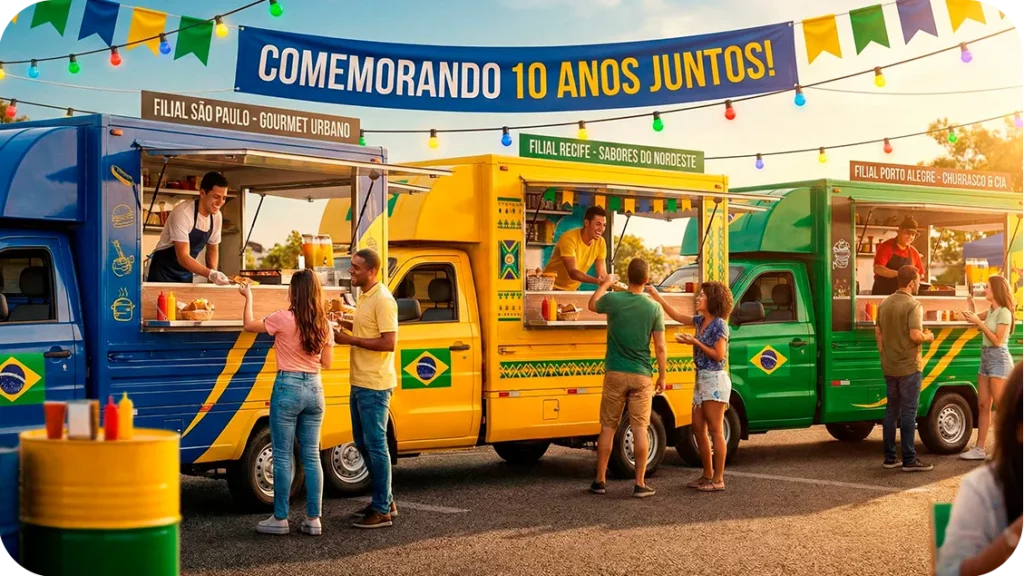 Escolha food trucks que representem comidas típicas de cada região onde a empresa atua. Use elementos visuais, expressões regionais e brincadeiras culturais para contextualizar cada filial.